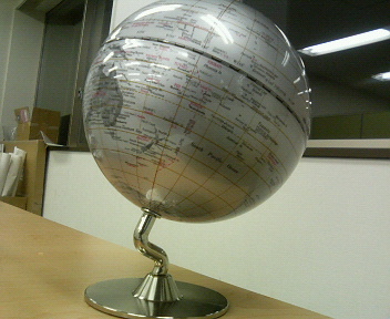 (↓銀色のかっこいい地球儀です。たまに富田さんがどこに逃亡しようかと眺めています。)