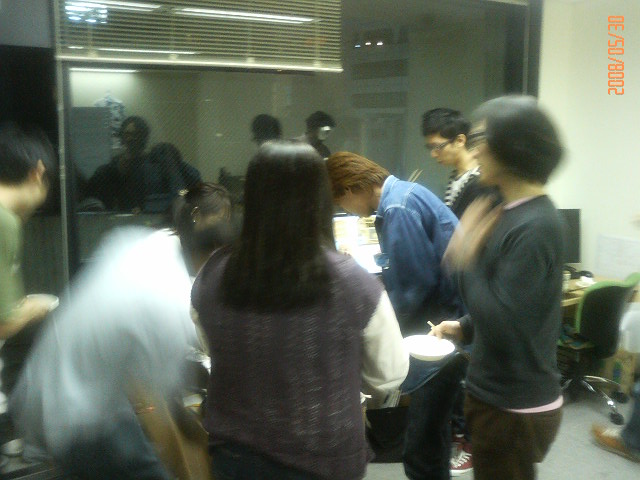 (↓オフィスで、牡蠣とビールに戯れる人々。ほぼ全員“牡蠣待ち”です。)