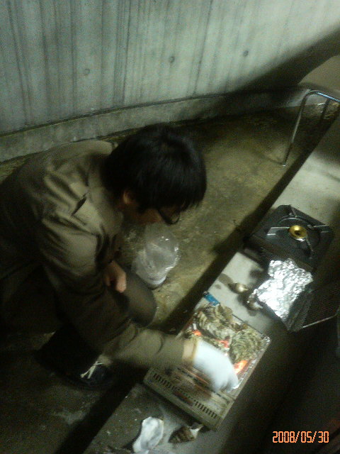 (↓主催の若狭委員長、地道に牡蠣を焼く姿がちょっと哀愁漂ってます…)